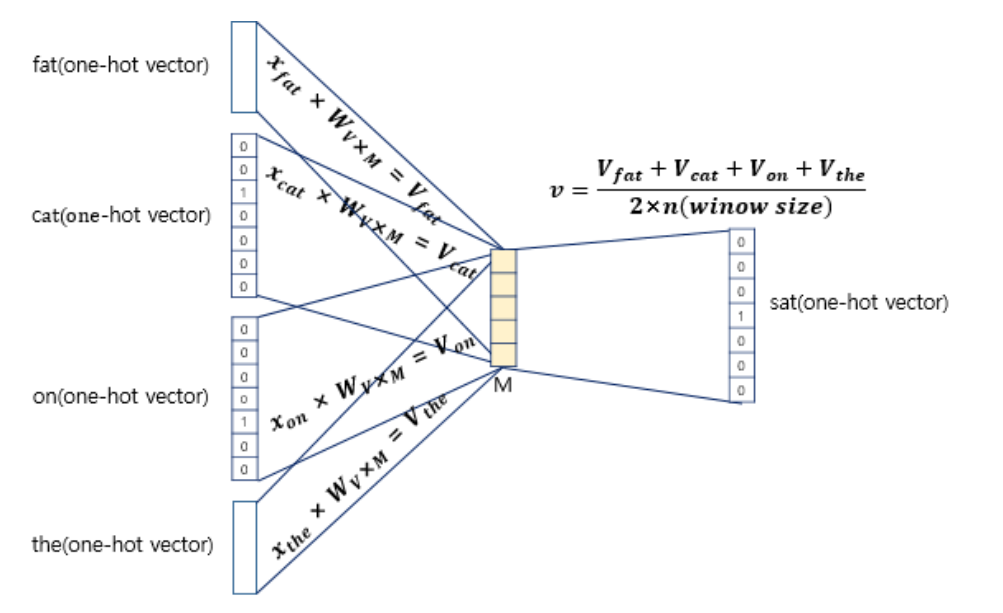 - 입력 벡터 : 윈도우 크기가 2라면, 입력 벡터의 총 개수는 2n이므로 중간 단어를 예측하기 위해서는 총 4개가 입력 벡터