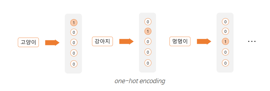 단어를 표현하는 가장 기본적인 방법은 '원-핫 인코딩'방식인데, 이는 단어를 하나의 벡터로 표현하는 방법으로 0과 1로만 표현하는 것이다. ( 그 단어를 의미하는 인덱스에만 1로 표시하고 나머지는 다 0으로 표시하는 것)