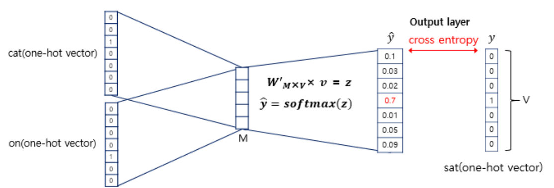 - 입력층과 투사층 사이의 가중치 W는 V × M 행렬, 투사층에서 출력층사이의 가중치 W'는 M × V 행렬.