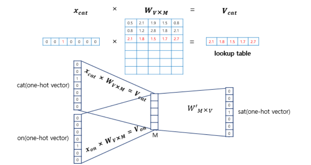 - 입력 벡터와 가중치 W 행렬의 곱은 사실 W행렬의 i번째 행을 그대로 읽어오는 것과(lookup) 동일