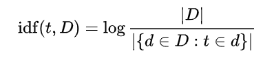 - DF(문서 빈도, document frequency)라고 하며, 이 값의 역수를 IDF(역문서 빈도, inverse document frequency)라고 한다.