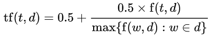 - 증가 빈도: 최빈 단어를 분모로 target 단어의 TF를 나눈 값으로, 일반적으로는 문서의 길이가 상대적으로 길 경우, 단어 빈도값을 조절하기 위해 사용한다.