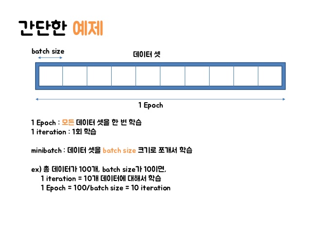 (한 번의 epoch는 인공 신경망에서 전체 데이터 셋에 대해 forward pass/backward pass 과정을 거친 것을 말함. 즉, 전체 데이터 셋에 대해 한 번 학습을 완료한 상태)