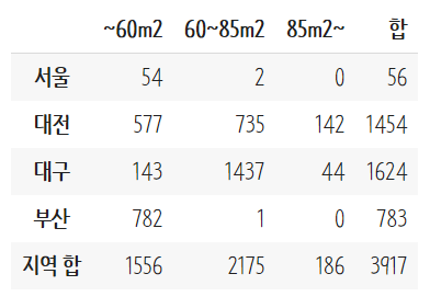 해당 데이터는 서울, 대전, 대구, 부산 4개의 지역과 60㎡이하, 60〜85㎡, 85㎡초과 3개의 규모로 이루어져 있다.